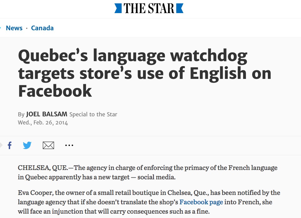 Eva Cooper, the owner of a small retail boutique in Chelsea, Que., has been notified by the language agency that if she doesn’t translate the shop’s Facebook page into French, she will face an injunction that will carry consequences such as a fine.